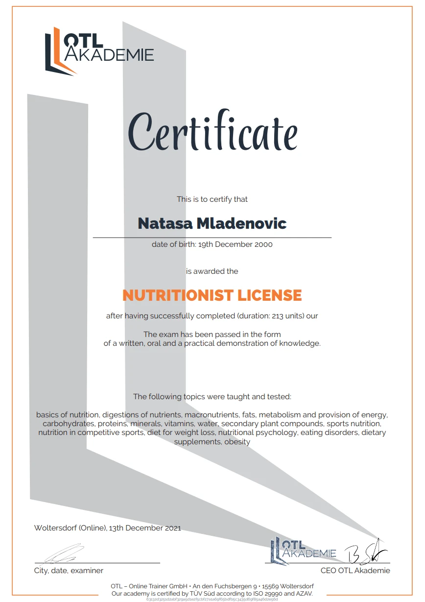 This comprehensive license from the German OTL Akademie is certified by TÜV Süd (ISO 29990), verifying the highest educational standards in nutritional science, psychology, and dietary management.